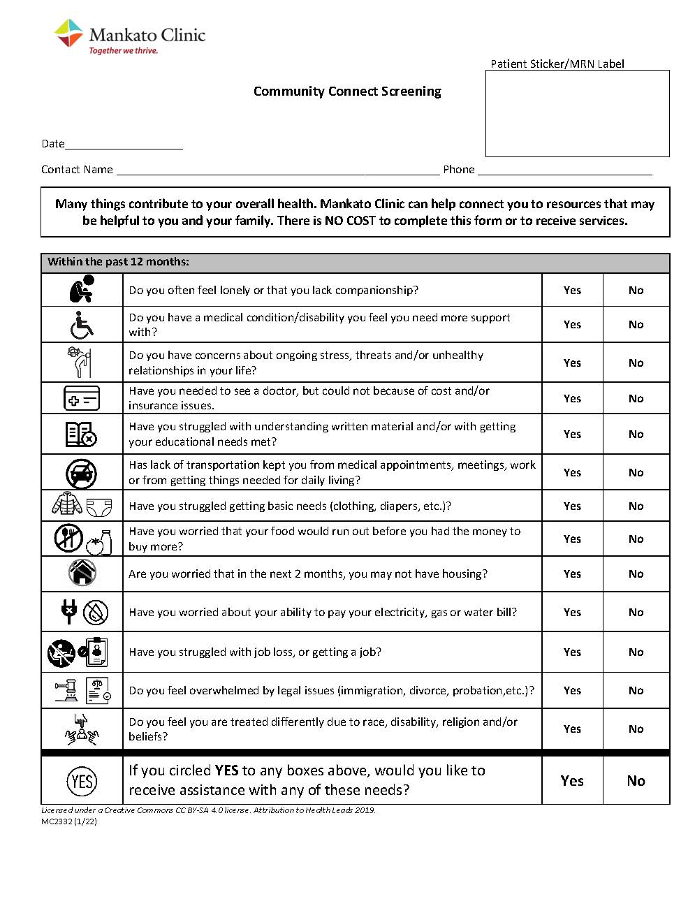Patients are asked to complete the Community Connect Screener once per year. The screener helps to identify if patients need help and support. There is no cost to complete the form or to receive services.